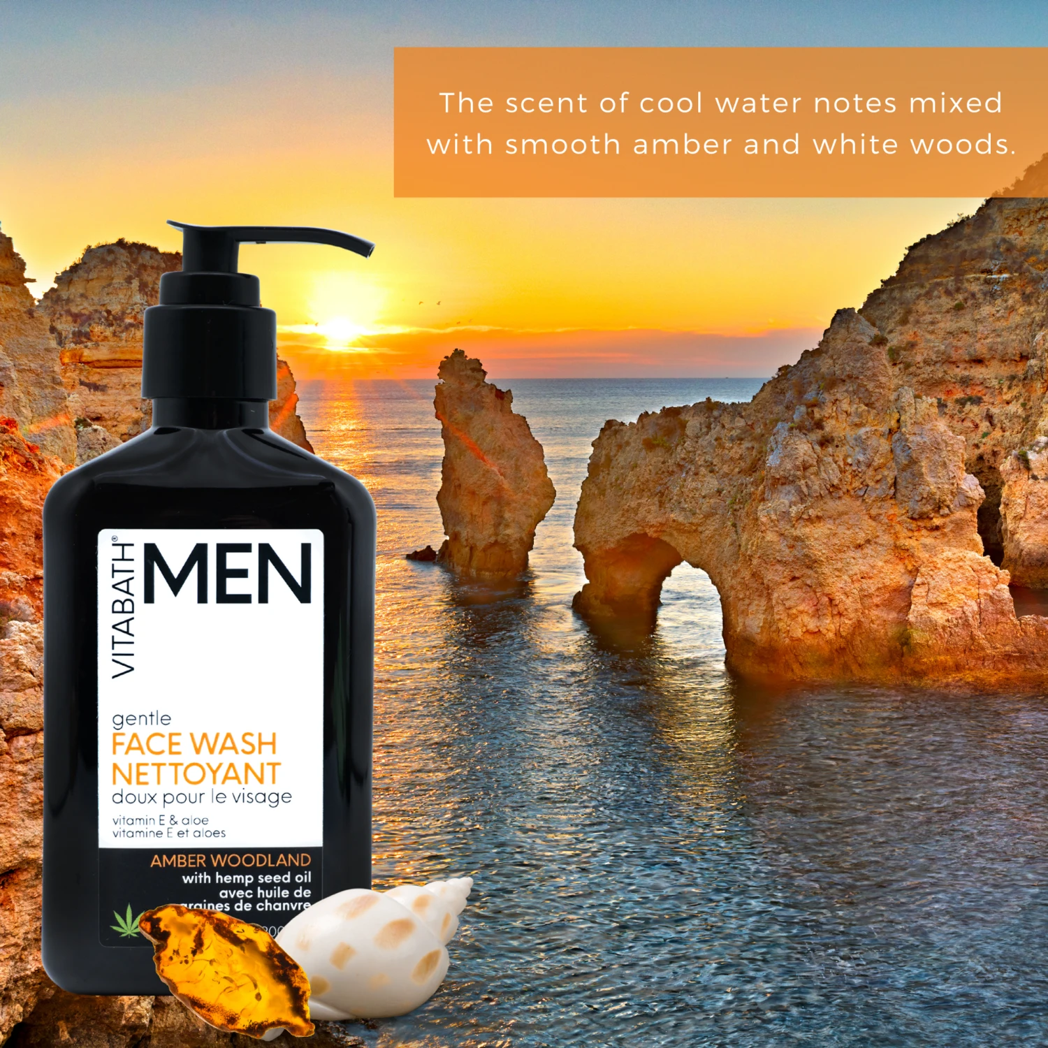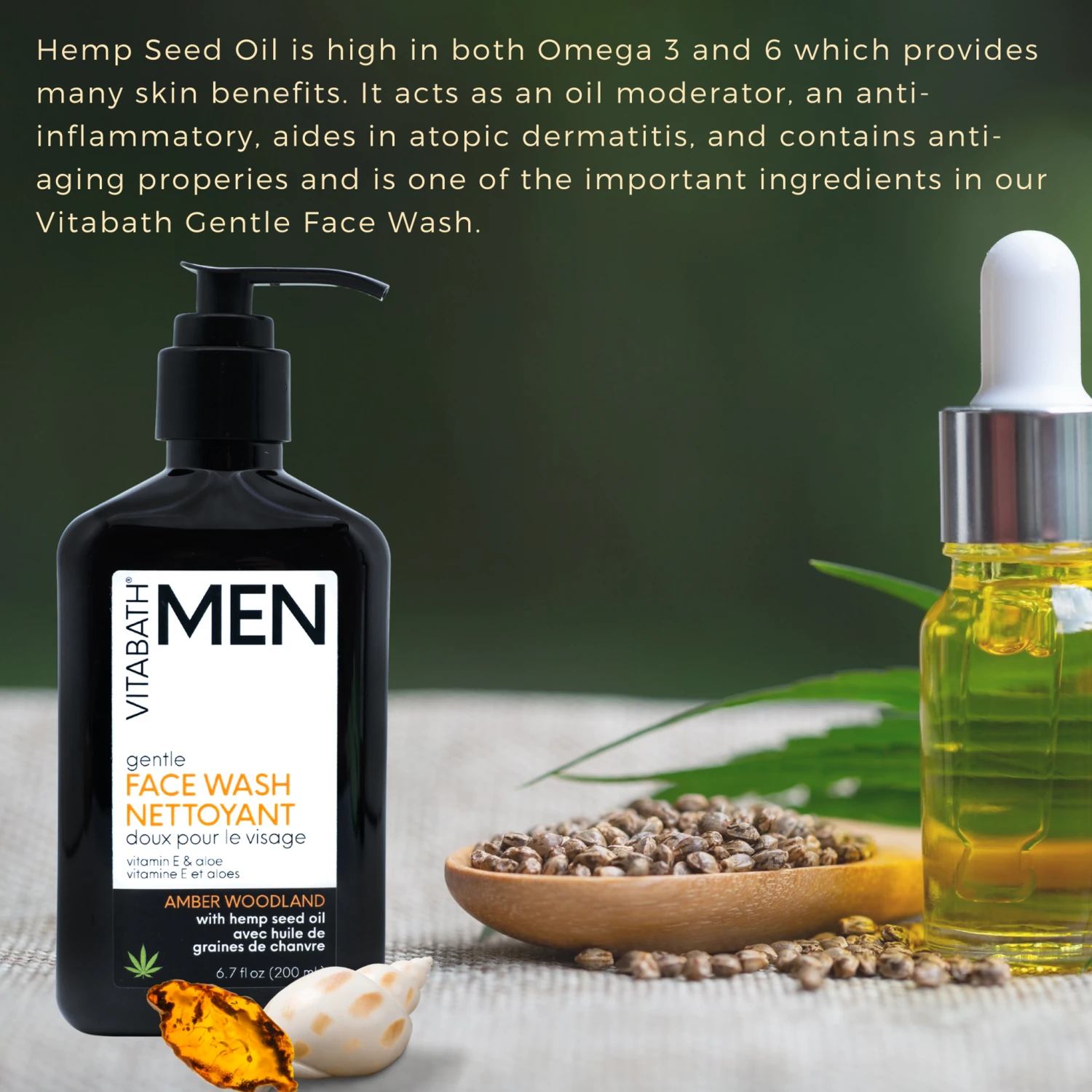 Packaged in an eight fluid ounce bottle that can sit neatly on your sink or in your medicine cabinet, our Amber Woodland Hemp Face Wash can be enjoyed by men and women. Apply this face wash to your face using your fingertips or a washcloth and gently massage it across your skin, then rinse. For the ultimate spa experience, use in the shower with our Amber Woodland All-In-One Wash and Soap On a Rope. You can also enhance the musky fragrance with Vitabath’s Amber Woodland Solid Cologne. Proudly made in Canada, this product has never been tested on animals in keeping with our company values. Also free of sulfates, parabens, dyes, silicones, propylene glycol and phthalates, this product is suited for several skin types.