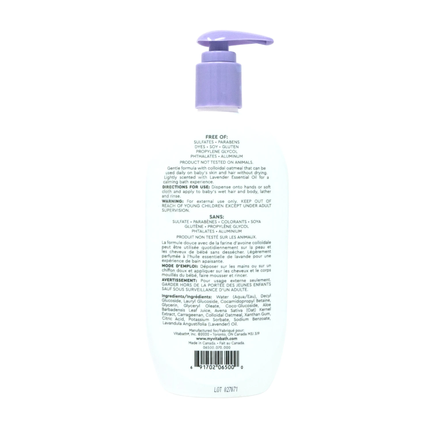 Ingredients/Ingrédients: Water (Aqua/Eau), Decyl Glucoside, Lauryl Glucoside, Cocamidopropyl Betaine, Glycerin, Glyceryl Oleate, Coco-Glucoside, Aloe Barbadensis Leaf Juice, Avena Sativa (Oat) Kernel Extract, Carrageenan, Colloidal Oatmeal, Xanthan Gum, Citric Acid, Potassium Sorbate, Sodium Benzoate, Lavandula Angustifolia (Lavender) Oil.
