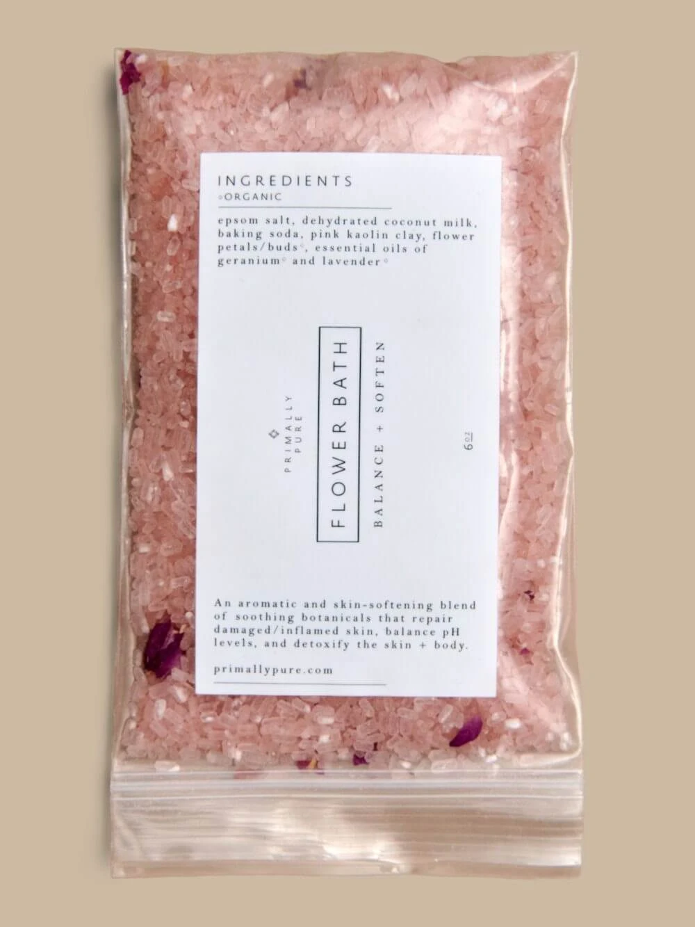 Flower Bath contains an aromatic and skin-softening blend of soothing botanicals that repair damaged/inflamed skin, balance pH levels, and detoxify the skin + body.