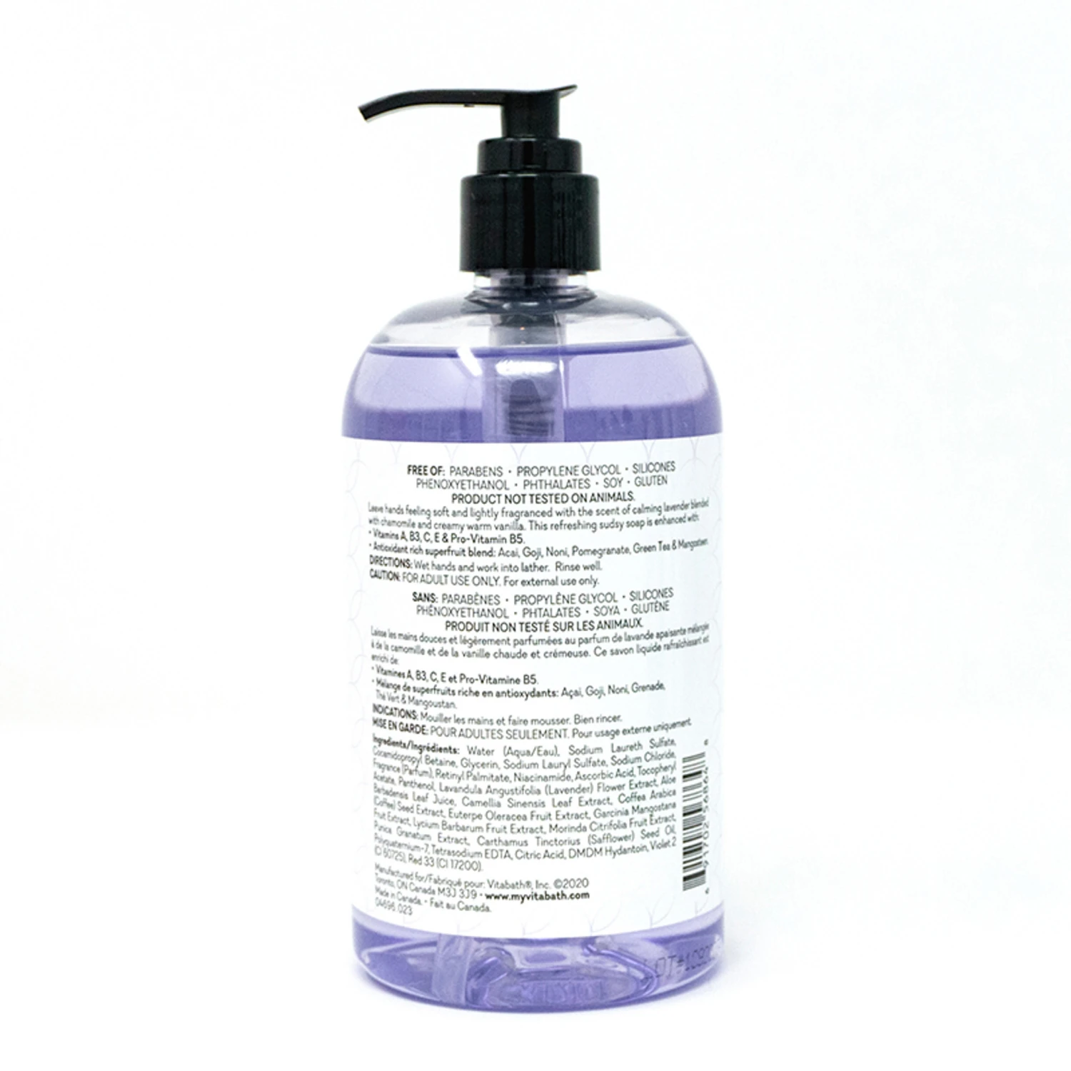 INGREDIENTS: Water (Aqua/Eau), Sodium Laureth Sulfate, Cocamidopropyl Betaine, Glycerin, Sodium Lauryl Sulfate, Sodium Chloride, Fragrance (Parfum), Retinyl Palmitate, Niacinamide, Ascorbic Acid, Tocopheryl Acetate, Panthenol, Lavandula Angustifolia (Lavender) Flower Extract, Aloe Barbadensis Leaf Juice, Camellia Sinensis Leaf Extract, Coffea Arabica (Coffee) Seed Extract, Euterpe Oleracea Fruit Extract, Garcinia Mangostana Fruit Extract, Lycium Barbarum Fruit Extract, Morinda Citrifolia Fruit Extract, Punica Granatum Extract, Carthamus Tinctorius (Safflower) Seed Oil, Polyquaternium-7, Tetrasodium EDTA, Citric Acid, DMDM Hydantoin, Violet 2 (CI 60725), Red 33 (CI 17200).