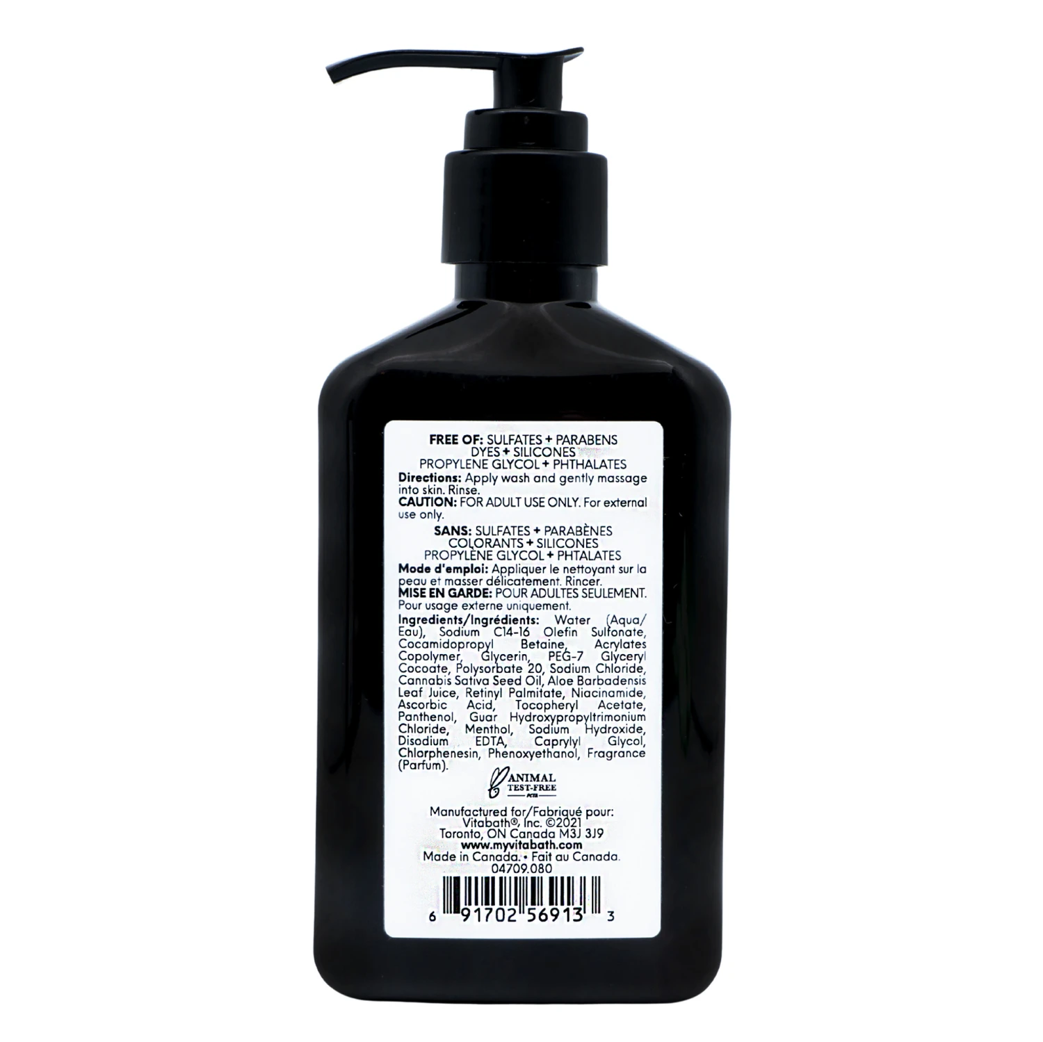 Ingredients/Ingrédients: Water (Aqua/Eau), Sodium C14-16 Olefin Sulfonate, Cocamidopropyl Betaine, Acrylates Copolymer, Glycerin, PEG-7 Glyceryl Cocoate, Polysorbate 20, Sodium Chloride, Cannabis Sativa Seed Oil, Aloe Barbadensis Leaf Juice, Retinyl Palmitate, Niacinamide, Ascorbic Acid, Tocopheryl Acetate, Panthenol, Guar Hydroxypropyltrimonium Chloride, Menthol, Sodium Hydroxide, Disodium EDTA, Caprylyl Glycol, Chlorphenesin, Phenoxyethanol, Fragrance (Parfum).