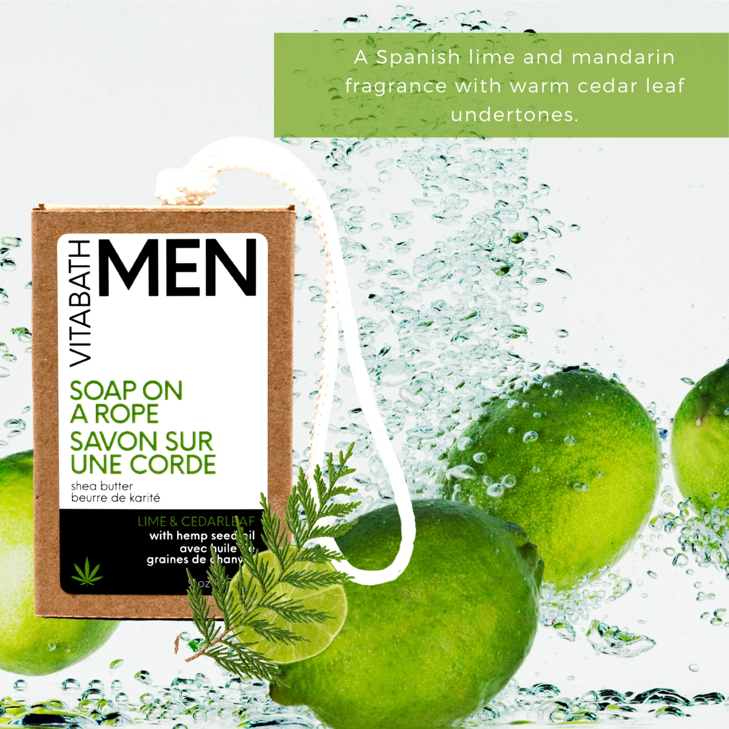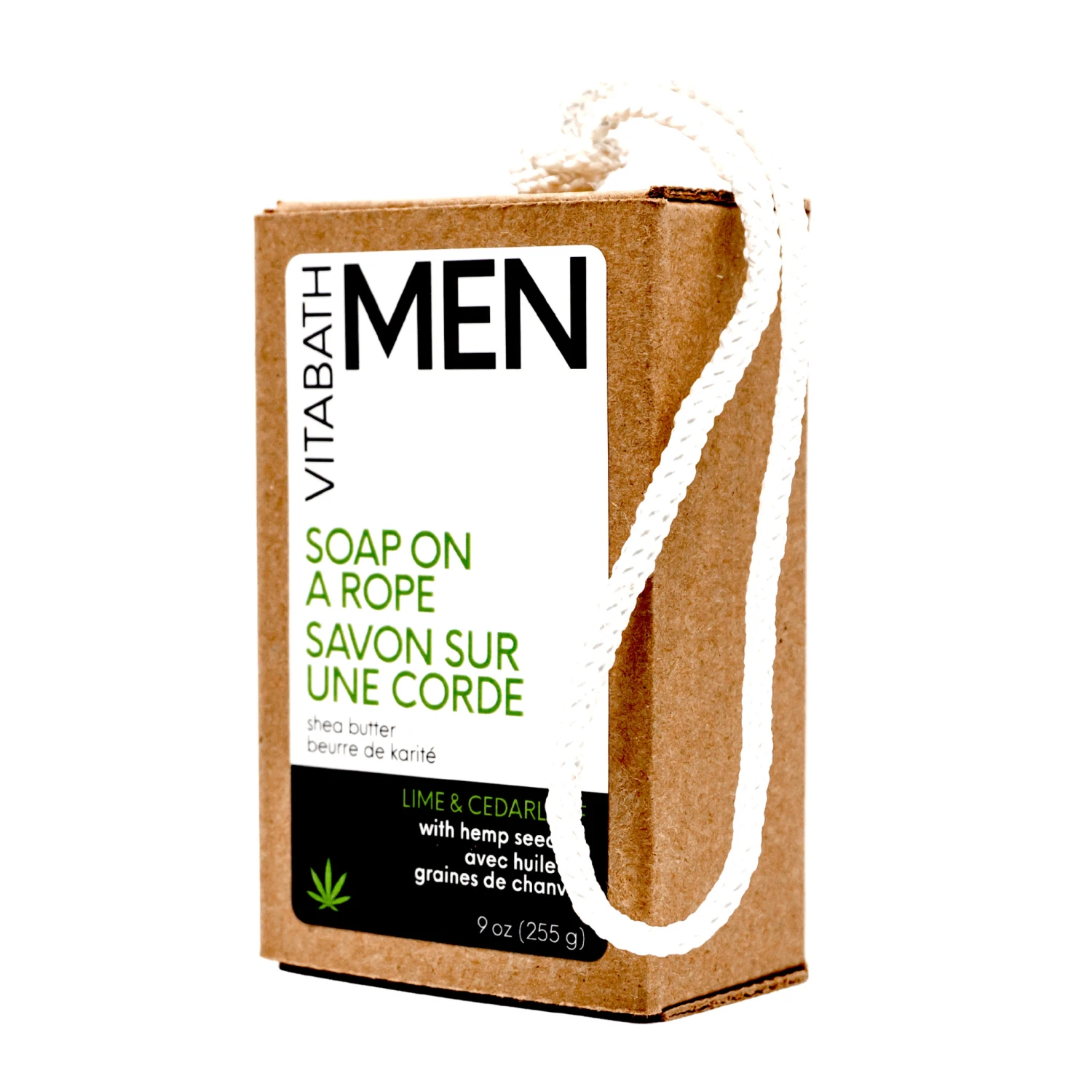 When looking for hemp seed oil bar soap, pick Vitabath’s nine-ounce Lime & Cedarleaf Soap on a Rope with hemp seed oil, shea butter and other nourishing ingredients.