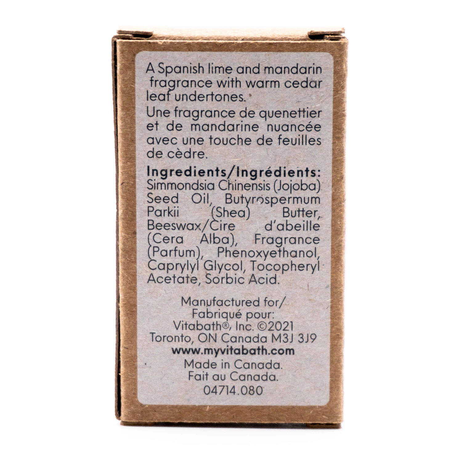 Ingredients/Ingrédients: Simmondsia Chinensis (Jojoba) Seed Oil, Butyrospermum Parkii (Shea) Butter, Beeswax/Cire d’abeille (Cera Alba), Fragrance (Parfum), Phenoxyethanol, Caprylyl Glycol, Tocopheryl Acetate, Sorbic Acid.