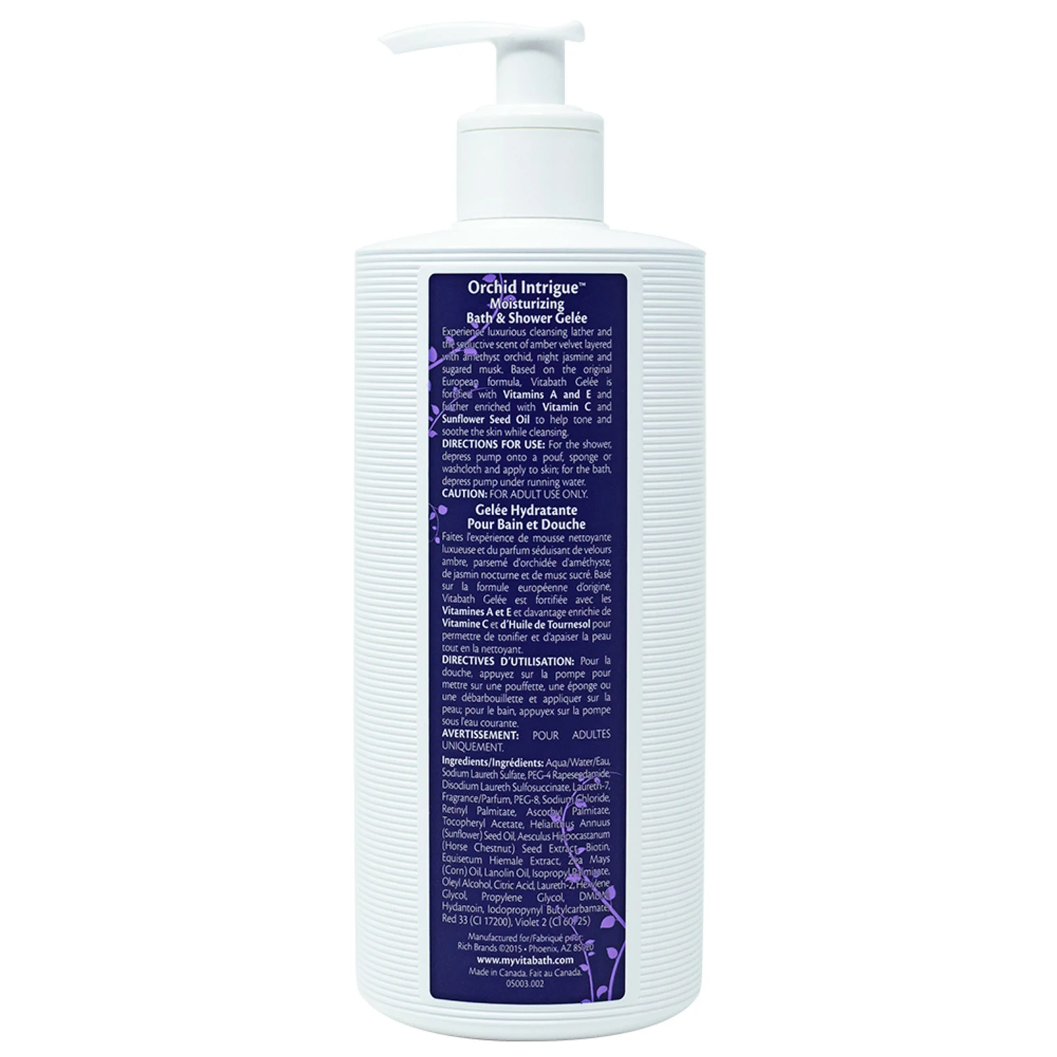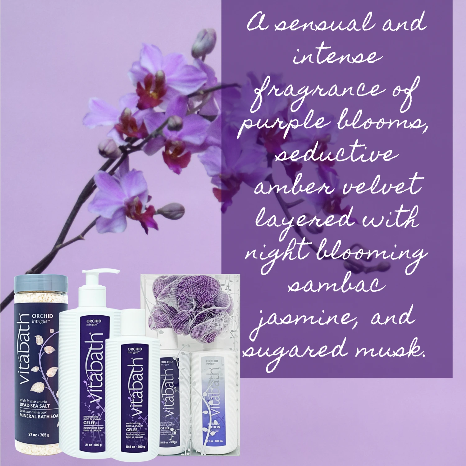 Experience luxury in a bottle with Orchid Intrigue™ Bath & Shower Gelée from Vitabath®. This incredible product features a scent that’s unbelievably sensual and alluring. Imagine the aroma from intense purple blooms of delicate amethyst orchids blended with the seductive scent of amber velvet. This complex and layered fragrance lingers on your skin long after you step out of the shower, providing an uplifting and soothing scent throughout the day.