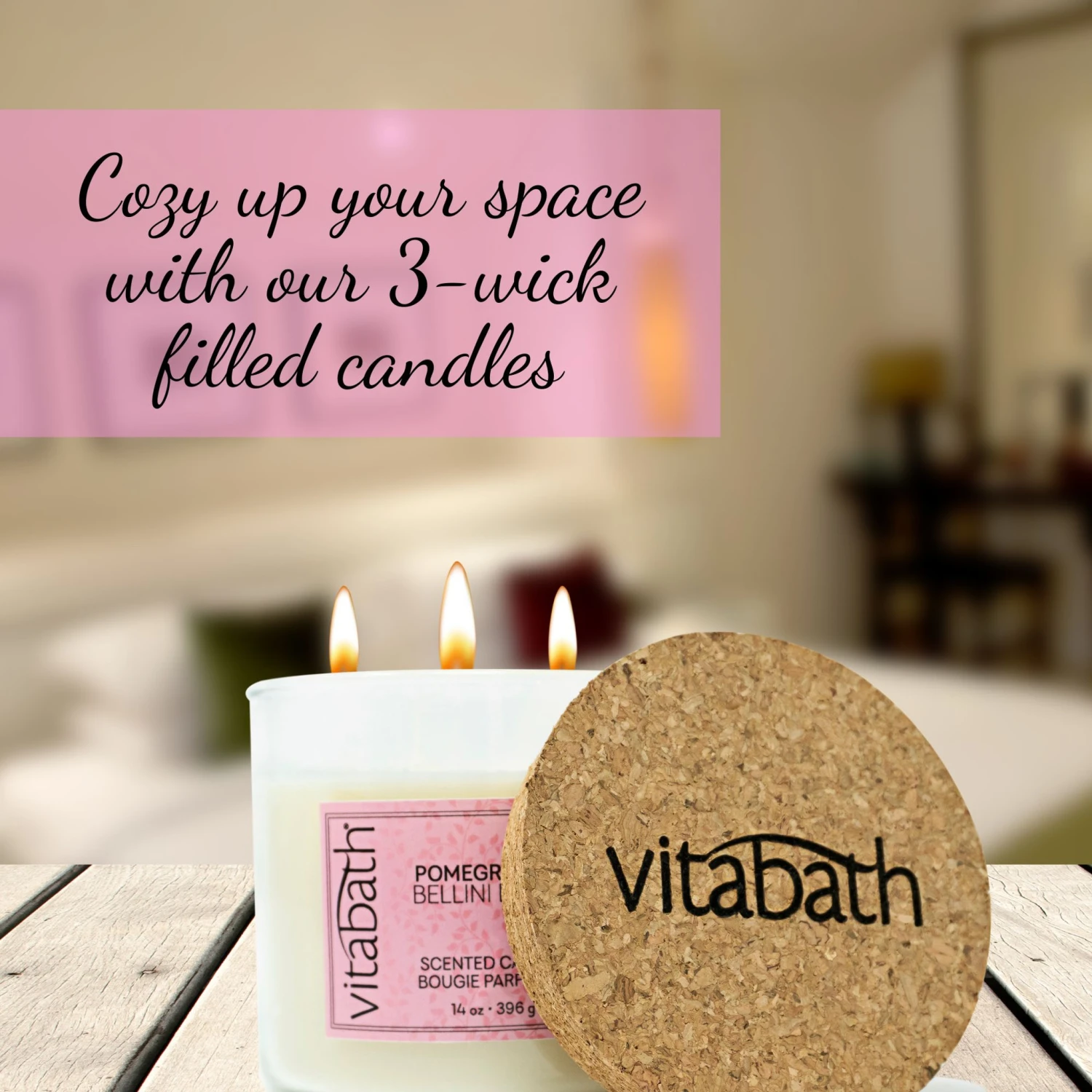 Add our Vitabath candle to set your Vitabath at-home spa experience over the top. This beloved fragrance is also available in our body- and soul-nourishing products. Layer this pomegranate fragrance when you use Vitabath’s family of Pomegranate Bellini Blush™ family of luxury spa products, including Pomegranate Bellini Blush™ Body Wash, Pomegranate Bellini Blush™ Fragrance Mist, Pomegranate Bellini Blush™ Bath Fizzies, Pomegranate Bellini Blush™ Body Cream, Pomegranate Bellini Blush™ Bubble Bath or Pomegranate Bellini Blush™ Hand-Wrapped Foaming Bath Bombs.