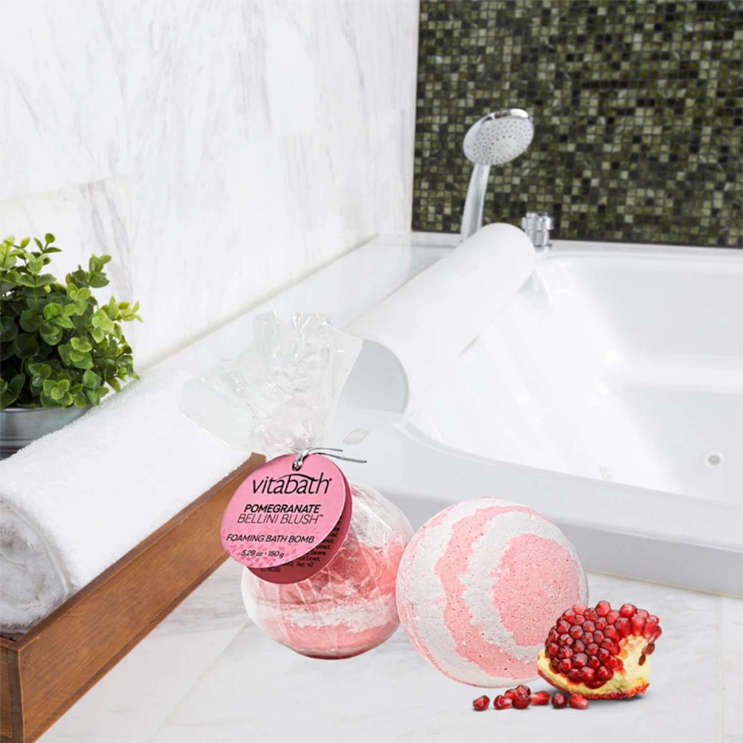 Kick off the fruit-infused festivities by dropping a Vitabath Pomegranate Bellini Blush™ Foaming Bath Bomb into a tub full of warm water. Then kick back, relax and enjoy.
