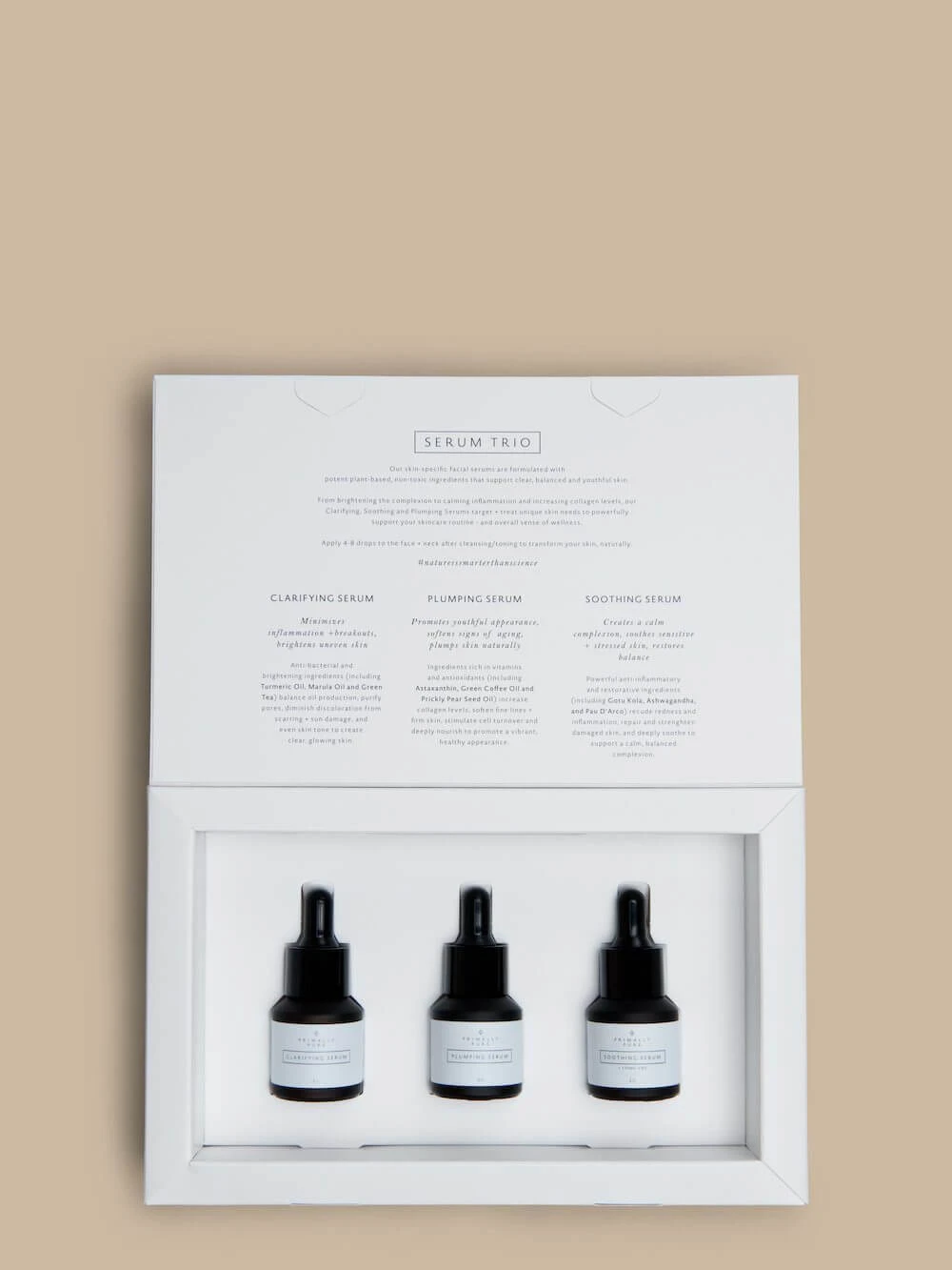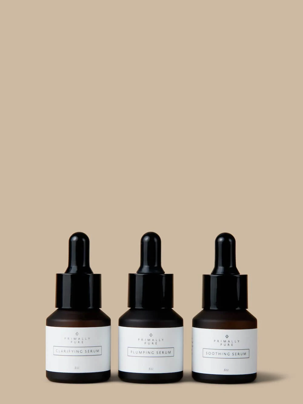Our skin-specific facial serums are formulated with potent plant-based, non-toxic ingredients that support clear, balanced and youthful skin. Our Serum Trio includes .5 oz bottles of each of our skin-specific serums.